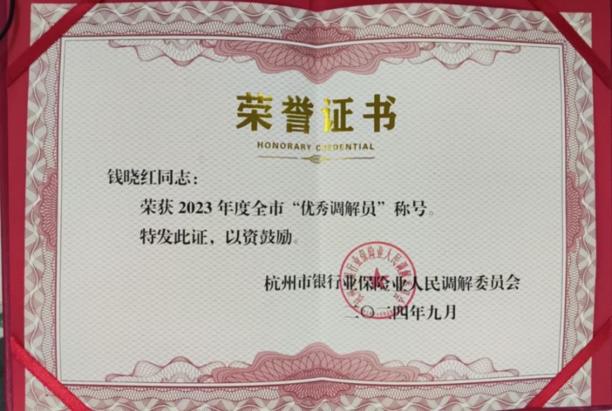 浙江分公司兼職調(diào)解員錢曉紅獲評年度“優(yōu)秀調(diào)解員”稱號