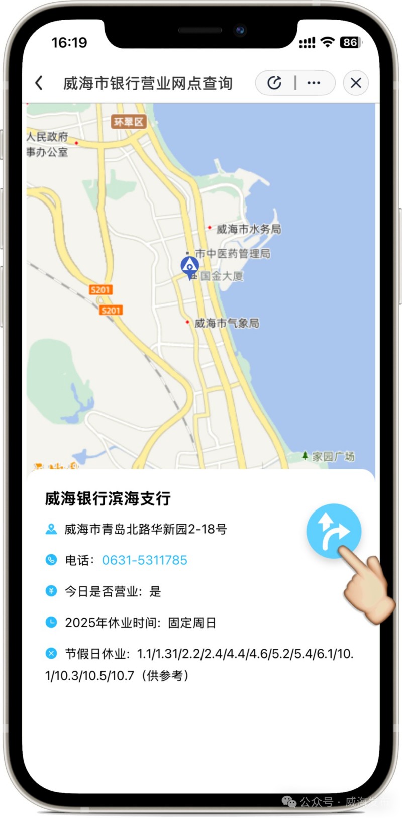平時上班不方便,周末休假想去銀行辦理業(yè)務(wù)又不知道銀行是否休假?以后再也不用發(fā)愁了!近日,威海市大數(shù)據(jù)局聯(lián)合國家金融監(jiān)督管理總局威海監(jiān)管分局,在“愛山東”APP(威海分廳)上線了“威海市銀行營業(yè)網(wǎng)點查詢”應(yīng)用,基于地圖為市民直觀便捷提供全市銀行網(wǎng)點營業(yè)休息信息的查詢服務(wù),再也不用擔(dān)心白跑一趟了!