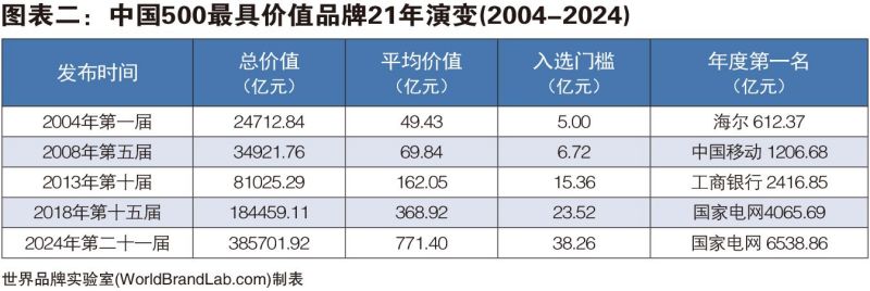 2024年《中國(guó)500最具價(jià)值品牌》的總價(jià)值為38.57萬(wàn)億元,比去年增加4.24萬(wàn)億元,增幅為12.35%。世界品牌實(shí)驗(yàn)室學(xué)術(shù)委員會(huì)主席、牛津大學(xué)(Oxford)營(yíng)銷學(xué)榮譽(yù)教授斯蒂芬·沃格(Steve Woolgar) 博士表示:“在過(guò)去的20多年中,我目睹了中國(guó)品牌的快速成長(zhǎng),有的已經(jīng)具有強(qiáng)大的世界影響力,這些品牌包括國(guó)家電網(wǎng)、海爾、中化、華潤(rùn)、中國(guó)南方電網(wǎng)、保利、河鋼、中國(guó)華電、五糧液、徐工、青島啤酒、中國(guó)國(guó)航、北大荒、東方電氣、通威、波司登、飛鶴、中國(guó)航油、恒力、協(xié)鑫、圣象、九牧、長(zhǎng)虹、雙星輪胎等?!笔澜缙放茖?shí)驗(yàn)室編制中國(guó)品牌報(bào)告已是第21個(gè)年頭,2004年入選門(mén)檻僅為5億元,前500名品牌的平均價(jià)值為49.43億元。21年以后的2024年,入選門(mén)檻已經(jīng)提高到38.26億元,而前500名品牌的平均價(jià)值高達(dá)771.40億元,增幅為1460.59%。本年度共有108個(gè)中國(guó)品牌的價(jià)值超過(guò)1000億,比去年增加36個(gè),彰顯了中國(guó)品牌經(jīng)濟(jì)的繁榮。